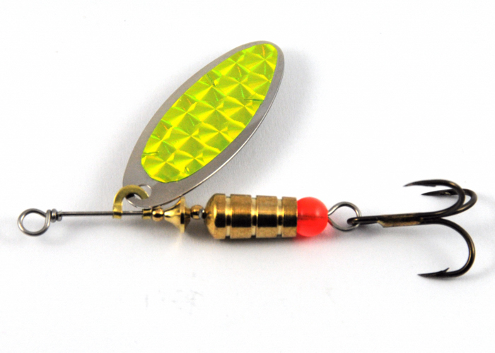 This spinner, is fitted with 38mm nickel plated brass swing blade and a Chartreuse prism sticker. The components used in this spinner are brass bearings for perfect spinning action, 0.76 mm stainless steel wire for strength and rigidity, 3.7 gram cylindrical brass body. The swing blade spins in a wider arc that creates more flash and will continue spinning at slow retrieves.
