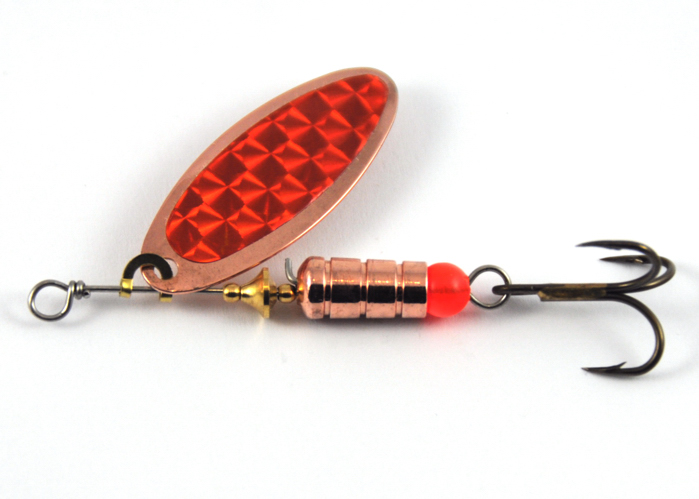 This spinner, is fitted with 38mm Copper plated brass swing blade and a Red prism sticker. The components used in this spinner are brass bearings for perfect spinning action, 0.76 mm stainless steel wire for strength and rigidity, 3.7 gram cylindrical brass copper plated body. The swing blade spins in a wider arc that creates more flash and will continue spinning at slow retrieves.